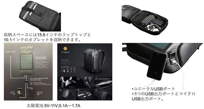 太陽光発電装置が搭載されたビジネス用の災害対策リュック「CIGS発電機付リュックサック」を販売しております。お気軽にお問い合わせください。